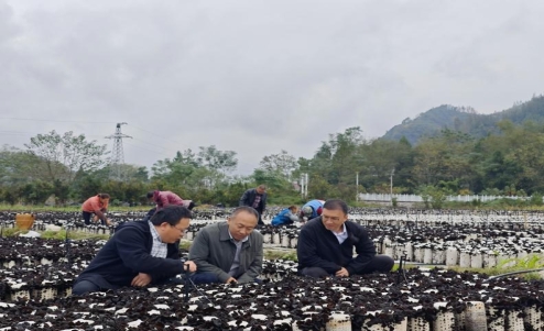 11日上午,调研组一行来到坝盘镇食用菌产业示范基地。踏入基地,一排排菌棒映入眼帘,朵朵黑木耳如花绽放,菌香混着山野的清新扑面而来,田间地头满是丰收的暖意。“依托所里食用菌团队的科研底子,借着江口的好山好水,我们派技术员驻点手把手指导,种出的木耳产量高、品质好。”生物所副所长向准指着菌棒满心欢喜地介绍着,“这不仅盘活了闲置土地,还让脱贫户、留守妇女在家门口就能挣钱,顾了家也增了收。”李安定点头赞许,强调道:“既要深入学习习近平总书记在贵州考察时的重要讲话精神,以科技创新和产业创新深度融合为抓手,推动食用菌产业标准化、规范化、集群化发展,带动所内其他科研团队联动学习,还要守住‘绿水青山就是金山银山’的理念,以科研赋能实效,稳步推进助农、兴农、富农工作,扎实做好脱贫攻坚成果和乡村振兴有效衔接。”