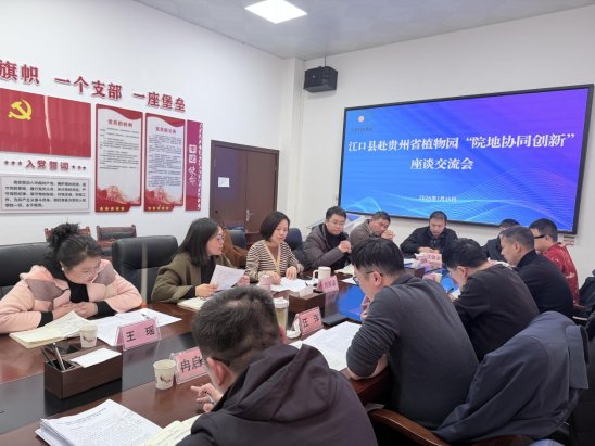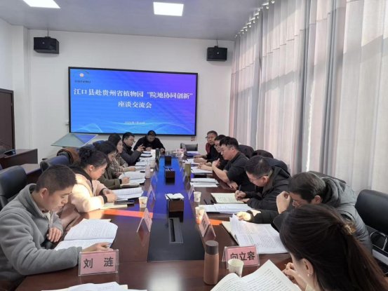 2026年1月15日,江口县委挂职副书记、贵州科学院驻村工作队队长汪洋、梵净山大健康管委会副主任冉启峰带队赴省植物园就江口县中药材产业“院地协同创新”深入座谈交流。省植物园高度重视此次交流,全体领导班子成员携相关科研团队共同参加座谈。