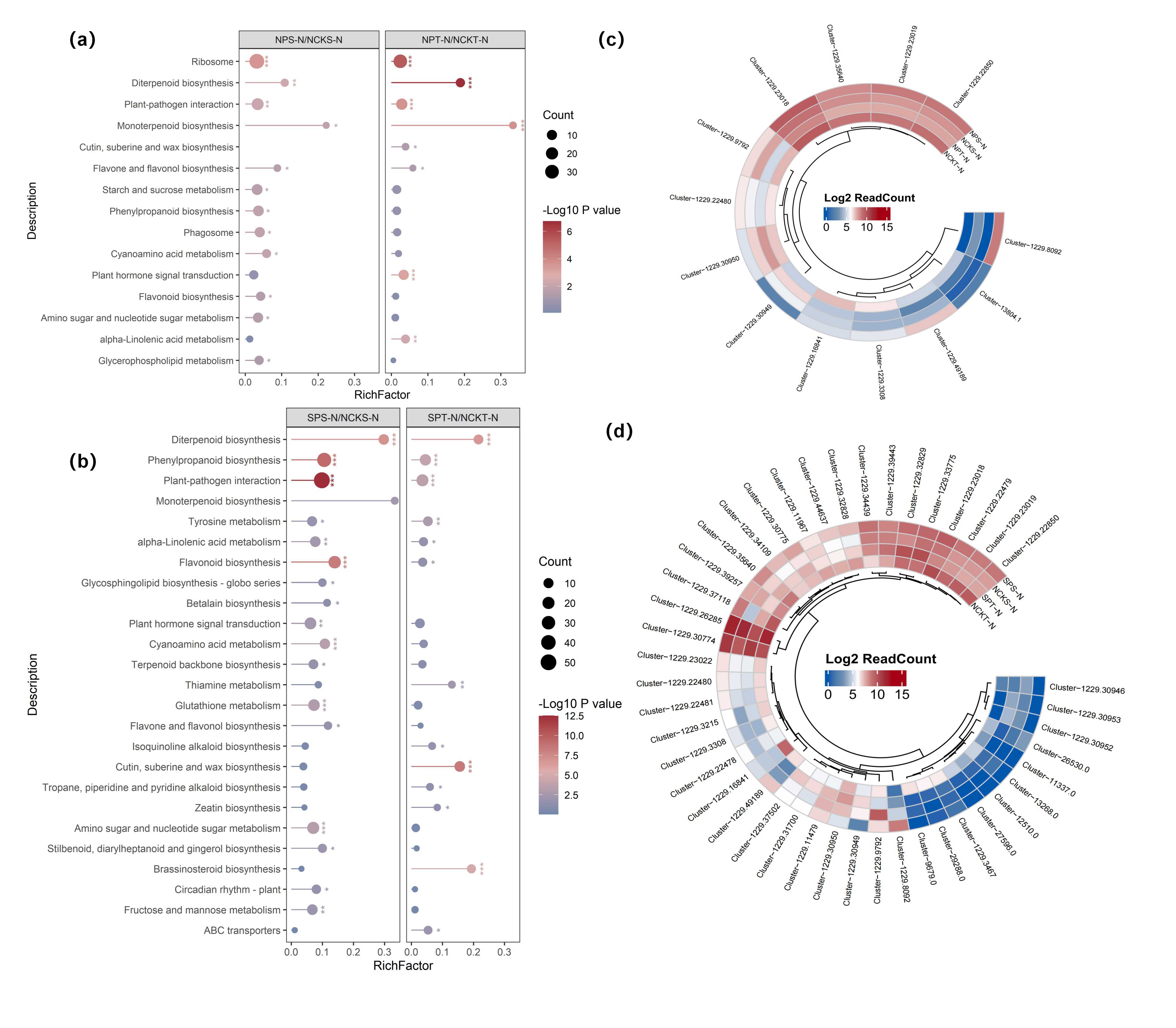 图2:不同处理条件下苯丙素类化合物生物合成的转录组富集及基因表达分析。