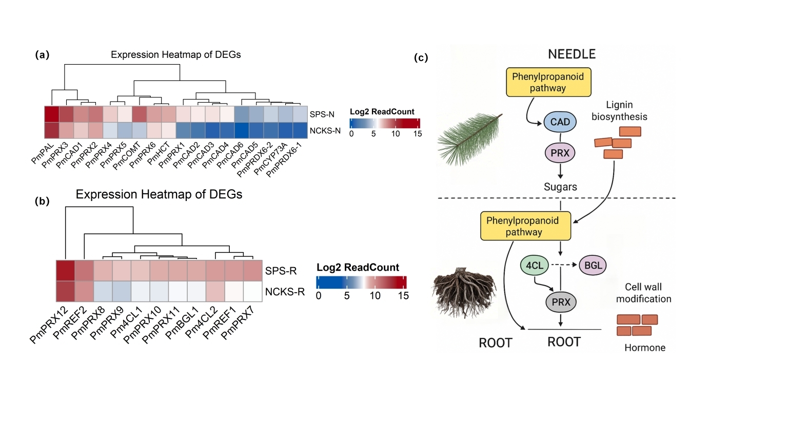 本研究以马尾松为对象,通过接种外生菌根真菌橙黄硬皮马勃(Scleroderma citrinum),结合形态学、生理测定、转录组分析及阿拉伯芥异源转化验证,系统探讨了外生菌根共生如何帮助马尾松缓解低磷胁迫。结果表明,外生菌根显著促进了幼苗根系发育和磷积累,并优化了根-茎-叶之间的磷分配。在分子水平上,共生关系特异性激活了苯丙烷—木质素合成通路:针叶中 PmCAD、PmPRX 等基因上调,增强了木质素单体合成与聚合;根系中 PRX、4CL、BGL、REF 等基因诱导表达,促进细胞壁重塑和共生界面构建。进一步功能验证发现,PmCAD3 和 PmPRX7 的过表达显著提高了转基因拟南芥在低磷环境下的磷积累能力。