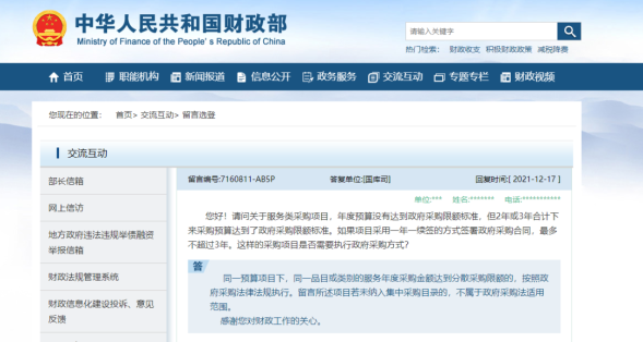 答复:同一预算项目下,同一品目或类别的服务年度采购金额达到分散采购限额的,按照政府采购法律法规执行。留言所述项目若未纳入集中采购目录的,不属于政府采购法适用范围。(来源:财政部官网)