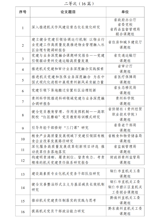 2025年10月31日,贵州省直机关党建网公布2025年度机关党建优秀课题研究成果,贵州科学院撰写的3项课题报告分别获得了一等奖1项、二等奖1项,优秀奖1项。