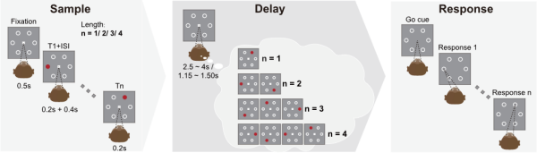研究团队设计了可变长度的序列工作记忆任务。在每个试次中,猕猴需要依次记住1、2、3或4个依次闪现的空间位置,并按顺序报告。这一任务要求猕猴维持多个记忆项目,还要根据当下的记忆负荷动态地组织这些信息。