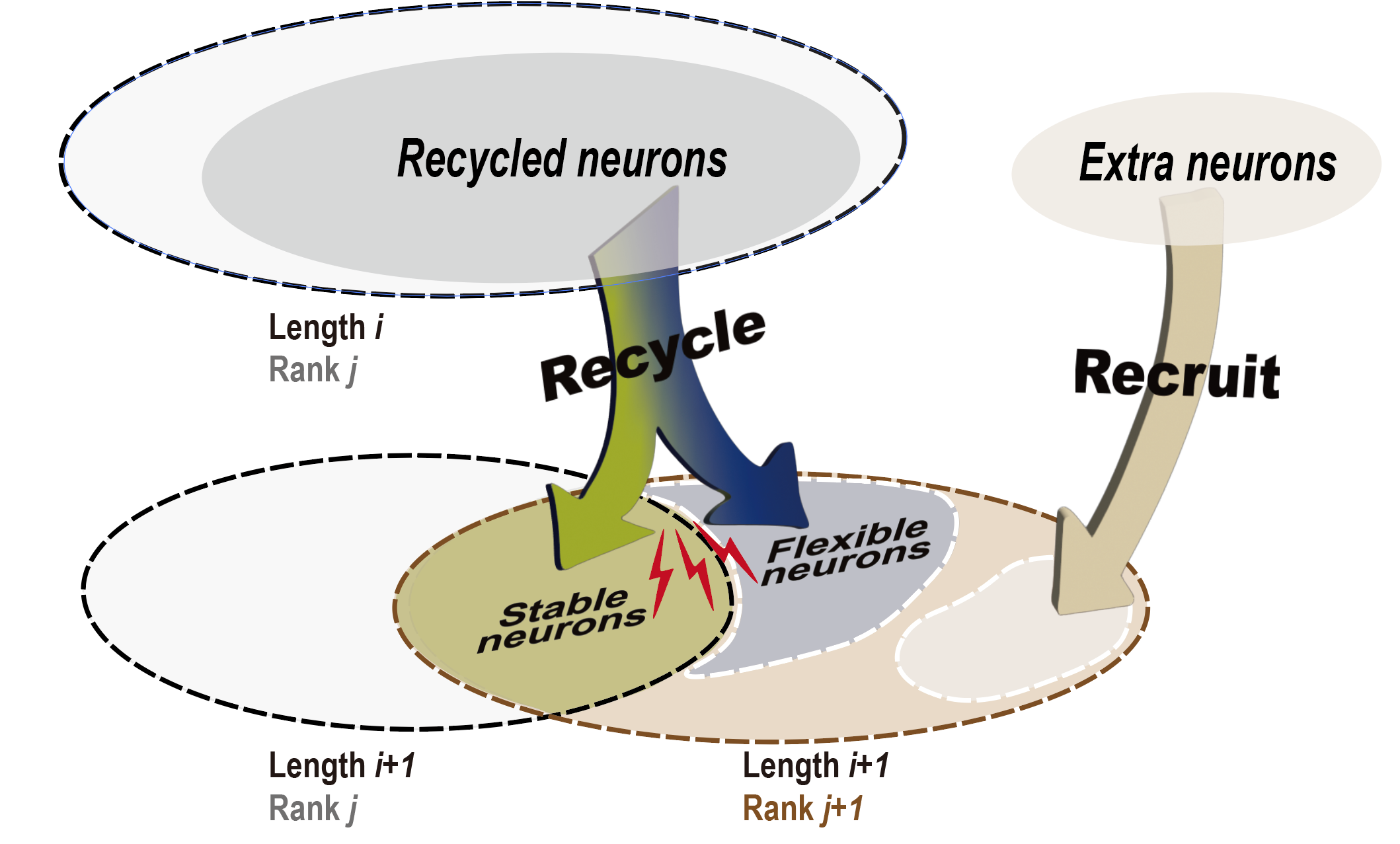 当新项目进入工作记忆时,前额叶可通过两种方式分配资源——招募新的神经元、循环利用已有神经元。循环利用的神经元包括稳定型(绿,兼顾旧/新信息)和灵活型(蓝,从旧信息切换到新信息)