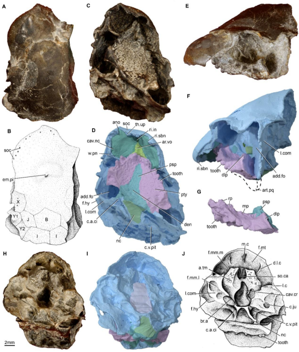 云南古嵴鱼的腭方骨与脑颅呈现部分融合状态,正处于从原始肉鳍鱼类“双接型”向真肺鱼类典型“自接型”头骨演化的过渡阶段,完美契合真肺鱼类基部的演化位置。