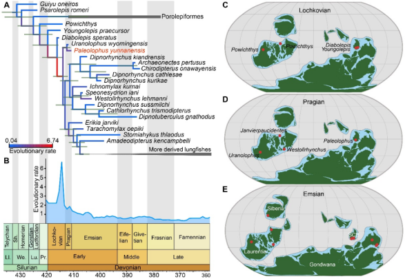 云南古嵴鱼的发现还带来了重要的古地理研究线索。其形态与北美早泥盆世真肺鱼的高度相似性,提示4.1亿年前华南板块与北美板块可能存在陆地连接或近距离分布,为肺鱼共同祖先的跨洋扩散提供了地理条件。